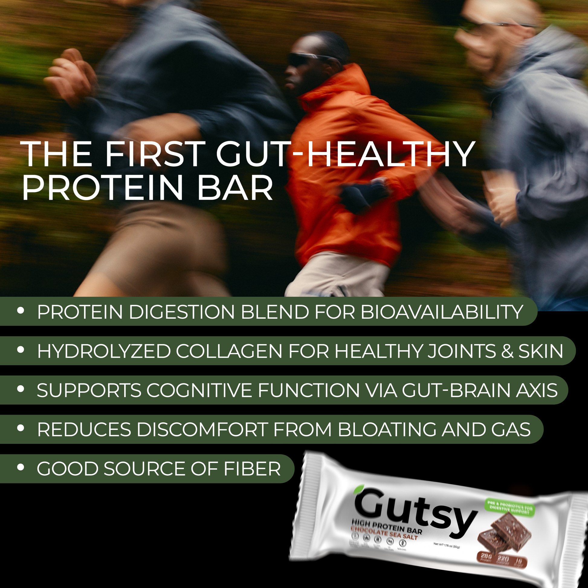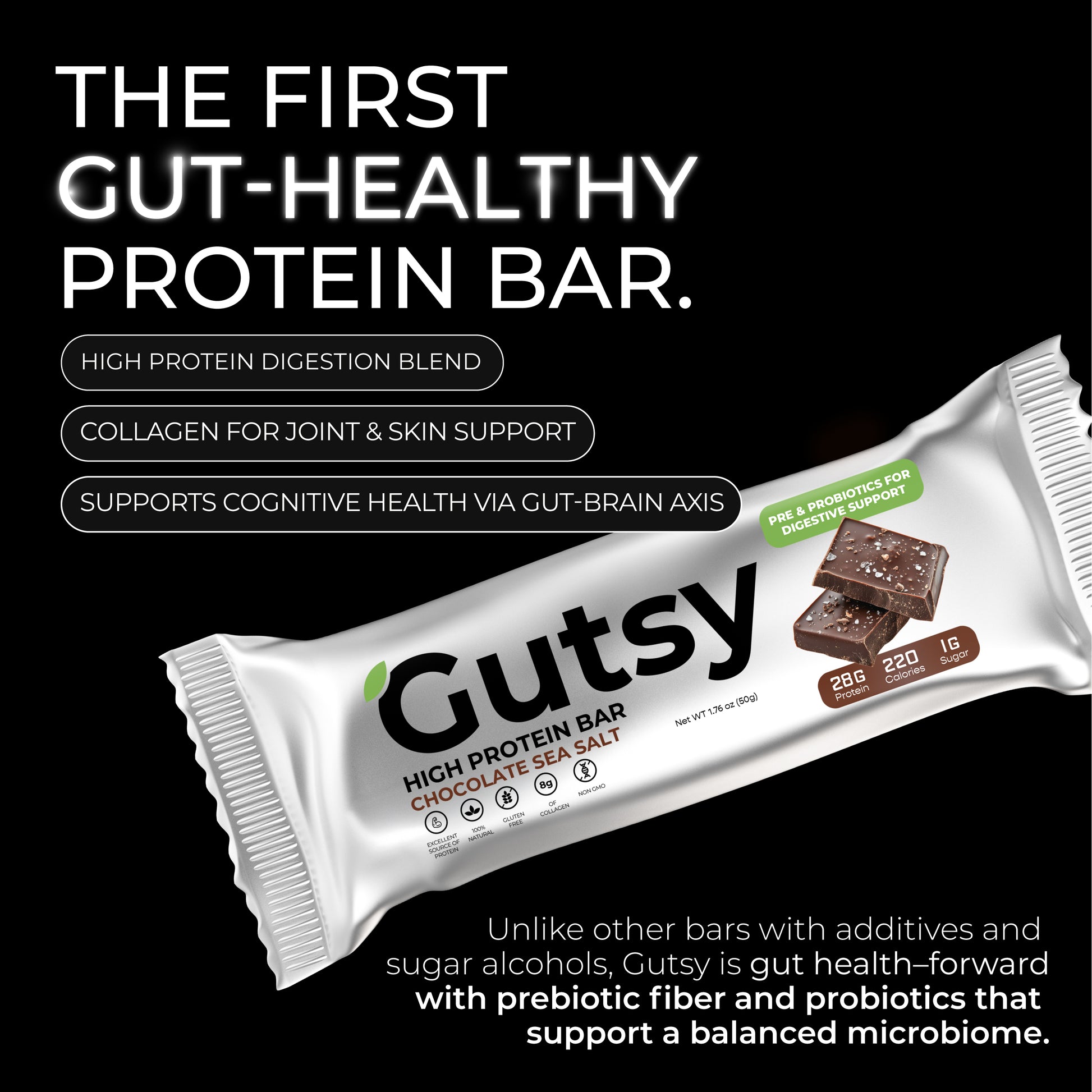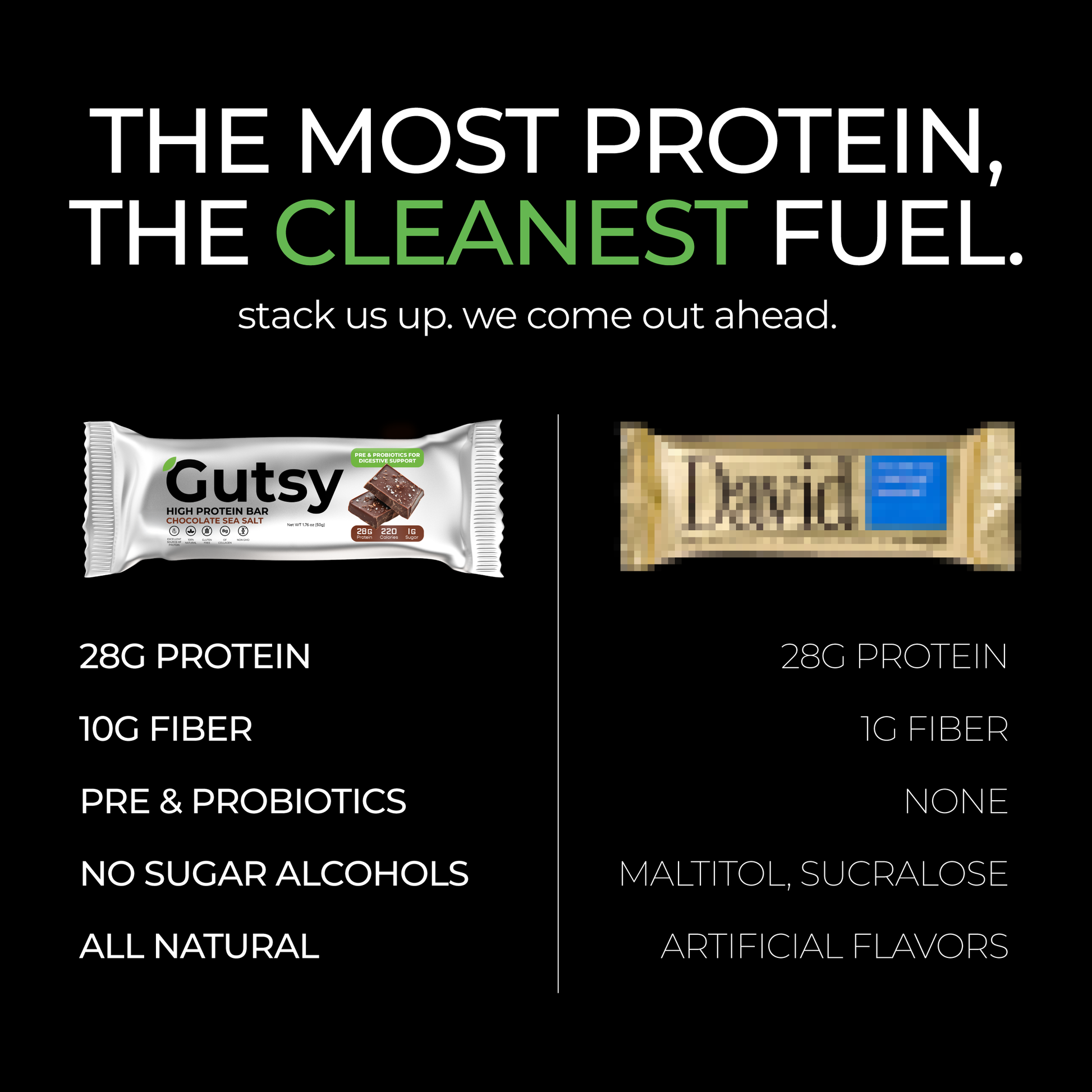Most bars focus only on protein. Gutsy delivers 28g protein plus probiotics, prebiotic fiber, and fermented ingredients - so you get strength, energy, and digestion support all in one.