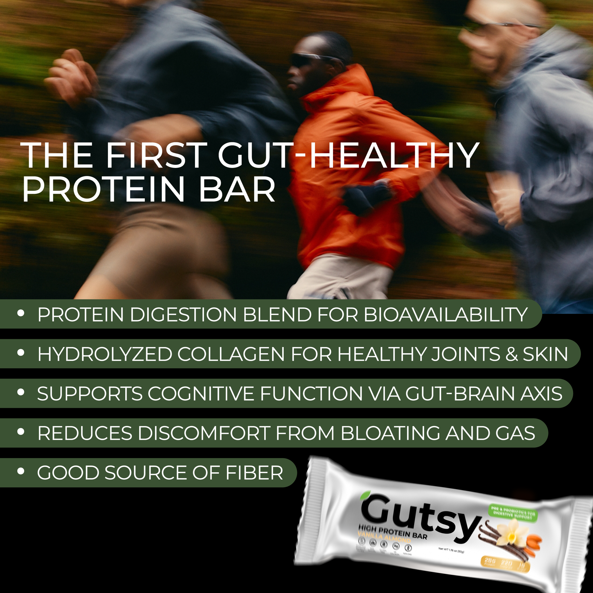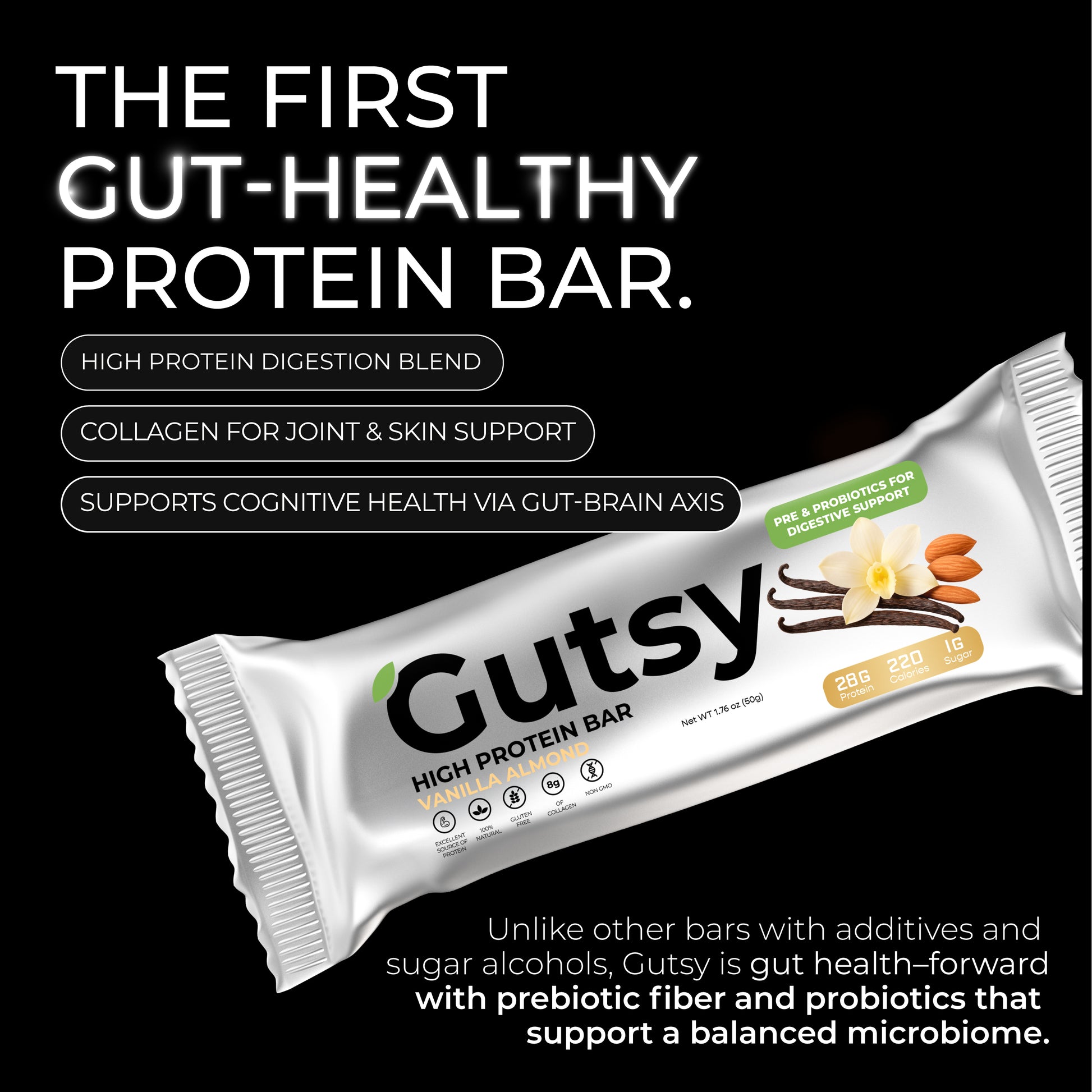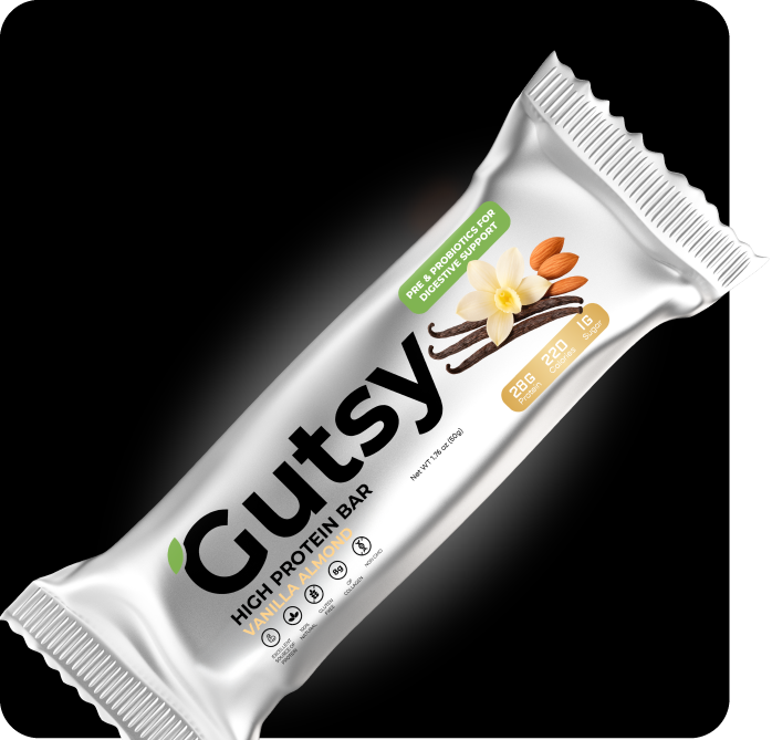 Smooth vanilla. Crunchy almonds. And gutsy science in every bite. With 28g of protein, 10g of prebiotic fiber, and billions of probiotics, this bar goes beyond fueling your day — it helps keep your gut balanced and your body moving strong.