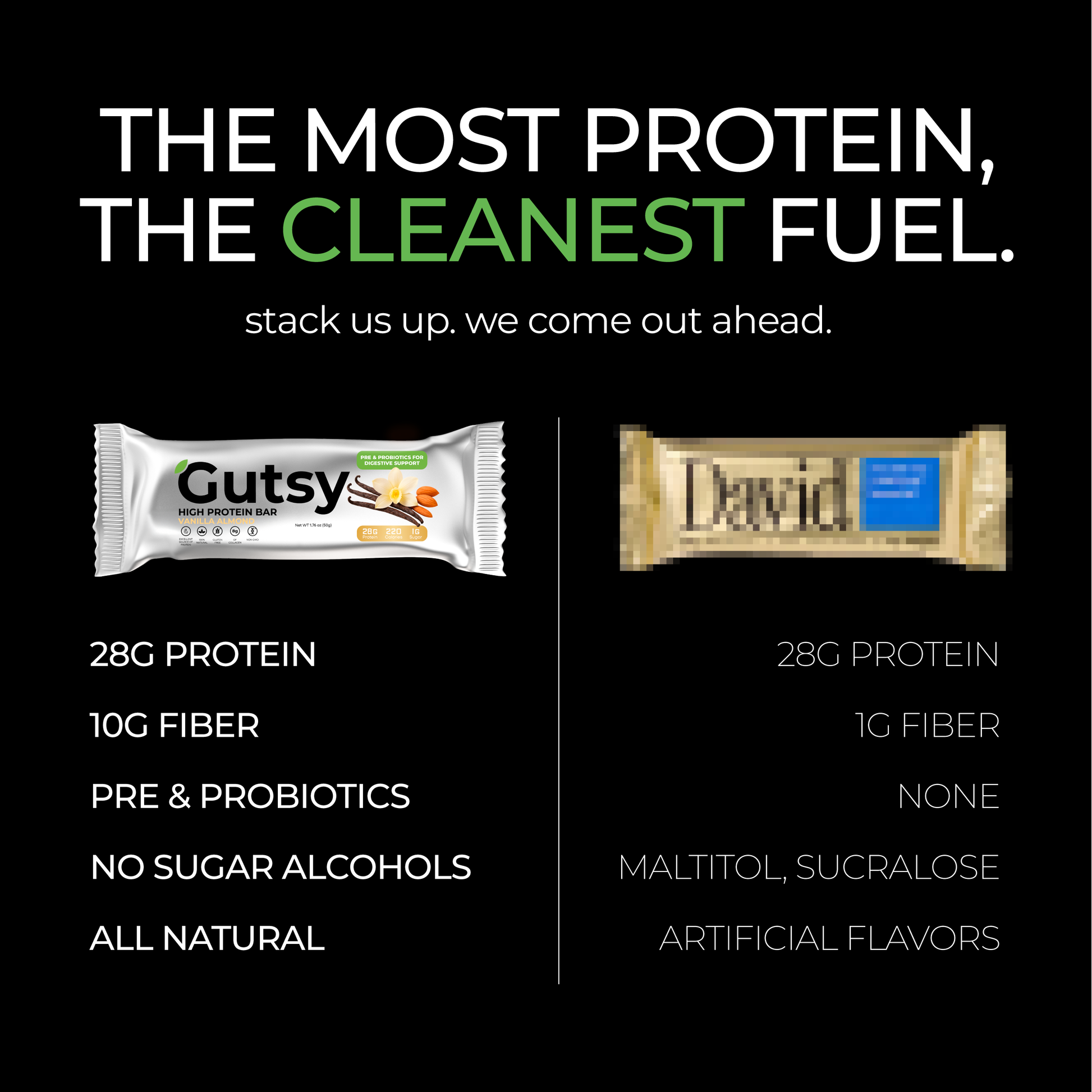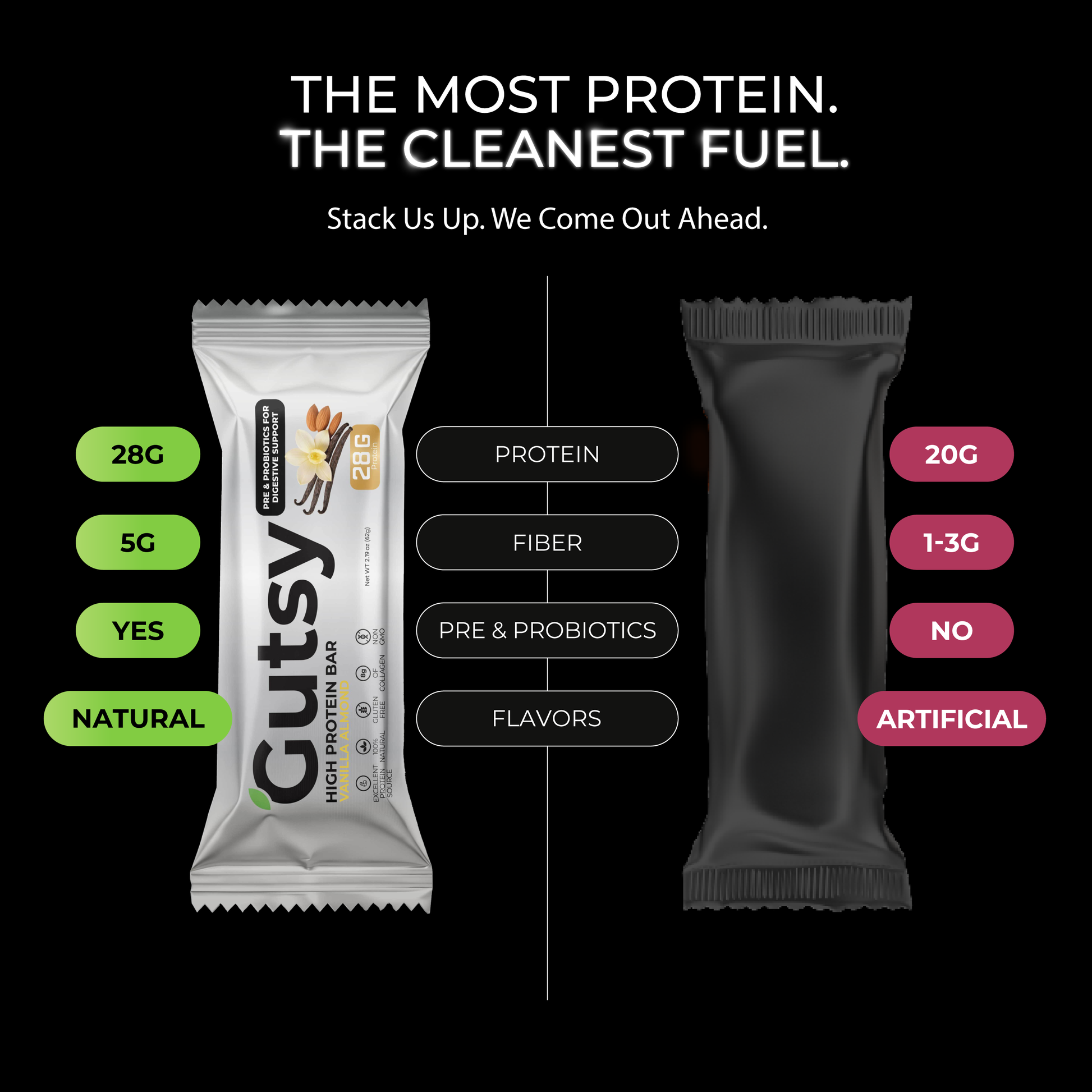 Most bars focus only on protein. Gutsy delivers 28g protein plus probiotics, prebiotic fiber, and fermented ingredients - so you get strength, energy, and digestion support all in one.