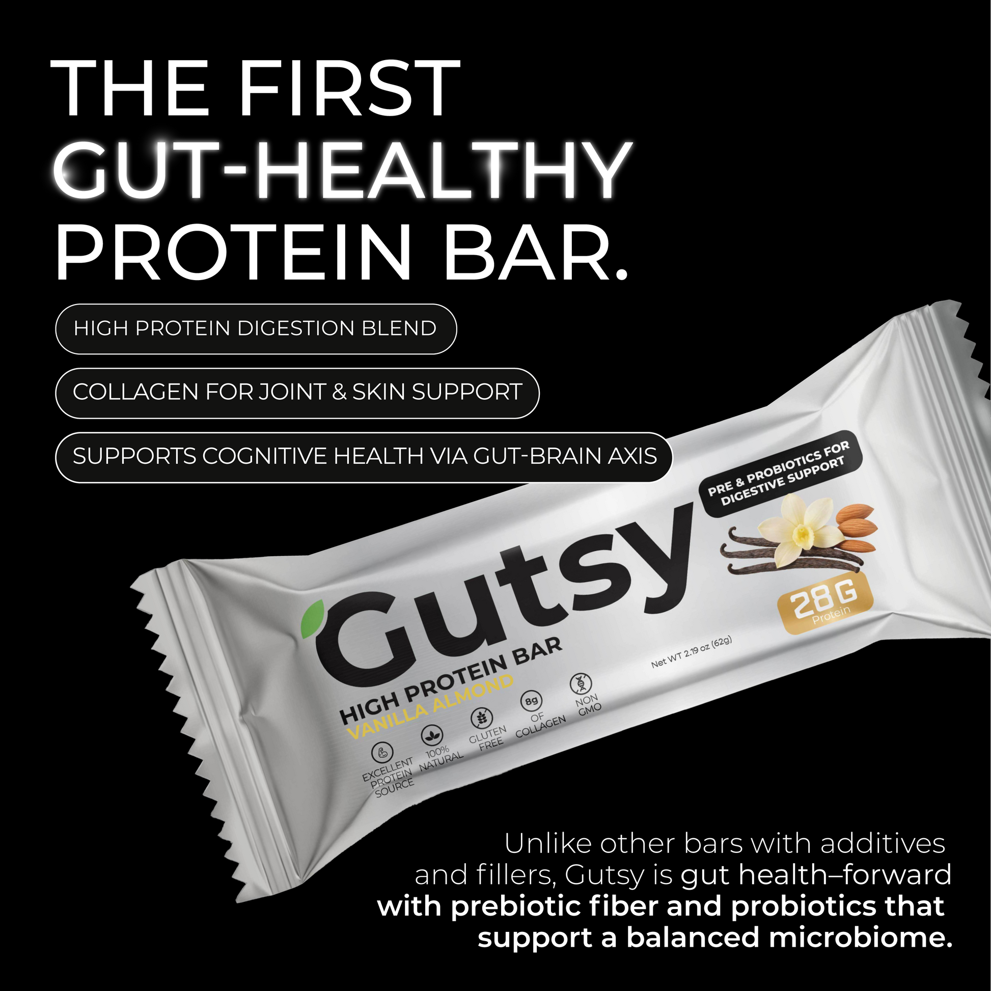 Smooth vanilla. Crunchy almonds. And Gutsy science in every bite. With 28g of protein, 5g of prebiotic fiber, and billions of probiotics, this bar goes beyond fueling your day — it helps keep your gut balanced and your body moving strong.